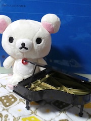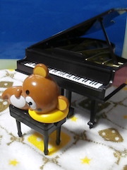 いよいよ、コリラックマちゃんのレッスンです。グランドピアノを前に、緊張気味のコリラックマちゃん。ハノンは上手に弾けたかな。