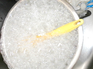 ★ステンレスの金盥に、クエン酸を溶かした所。粉石鹸のスプーン5杯分くらい。