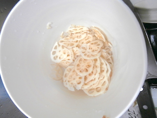 ★半額で買った、レンコンをスライサーで薄くスライスして、酢水で洗います。