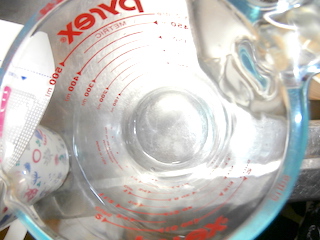 ジュースをパイレックスに半分だけ移して、電子レンジで加熱します。