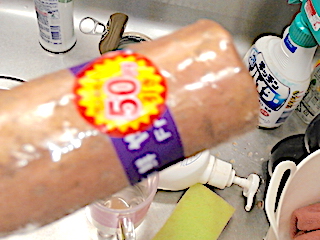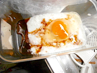 めんつゆをかけています。保存容器は、無印良品のタッパー。