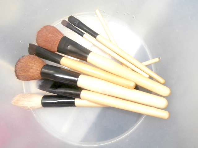 洗面器に、使っているメイクブラシを放り込んでみました。