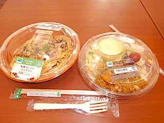 コンビニで、大豆ミートのサラダと、あさりのボンゴレ。
